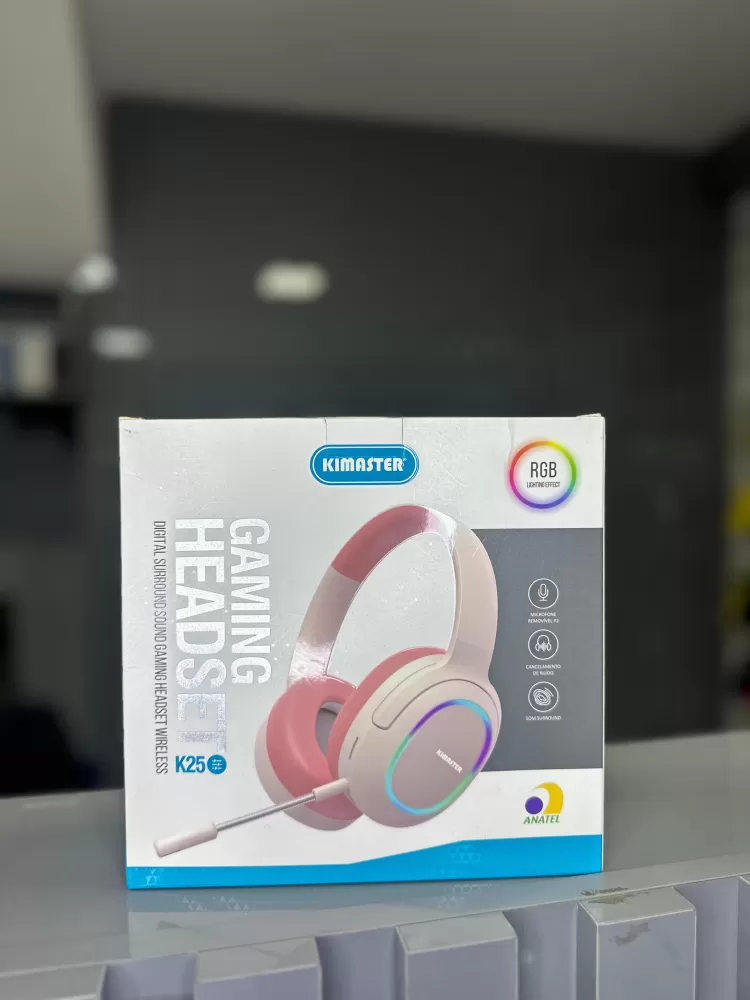 O Headset Gamer Kimaster K25 é projetado para oferecer uma experiência de áudio imersiva e comunicação de alta qualidade, combinando um design moderno e esteticamente agradável (com acabamento em tons de rosa e branco) com recursos essenciais para gamers e entusiastas de áudio. Destaca-se por sua iluminação RGB e áudio com som surround, ideal para jogos, músicas e filmes.
